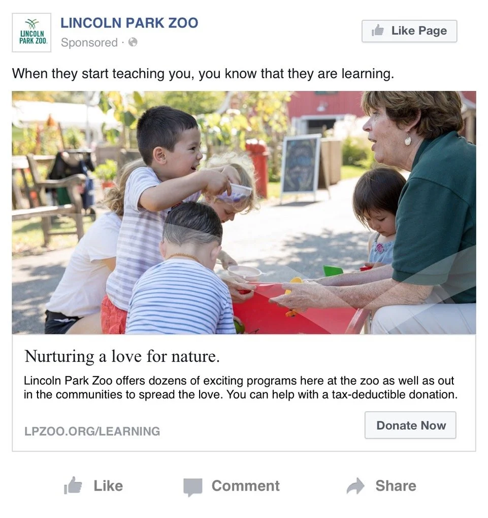 Brought in to shine up the 150 year old Chicago gem. Instead of driving visits, Lincoln Park Zoo wanted to educate Chicagoans (and beyond) about their world class animal conservation. FB Page visits and donations were the key metrics Campaign raised $5.2 million in donations with an increase of page visits 23% YoY.